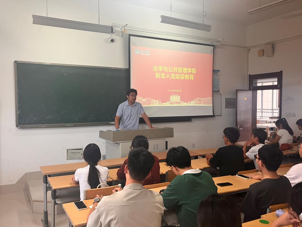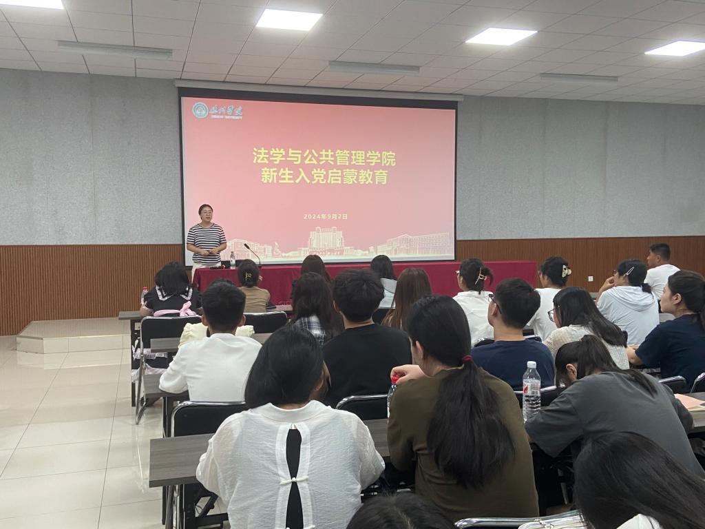 为做好新生思想政治教育,引导青年学生听党话,跟党走,提高学生对党的认识,吸引更多学生积极向党组织靠拢,92日下午,法学与公共管理学院学生党支部开展2024级新生入党启蒙教育活动,此次活动紧密围绕党的性质、党的宗旨、党的初心,并结合入党动机、要求及流程等关键要素,为2024级新生上了大学阶段的第一堂生动而深刻的党课。