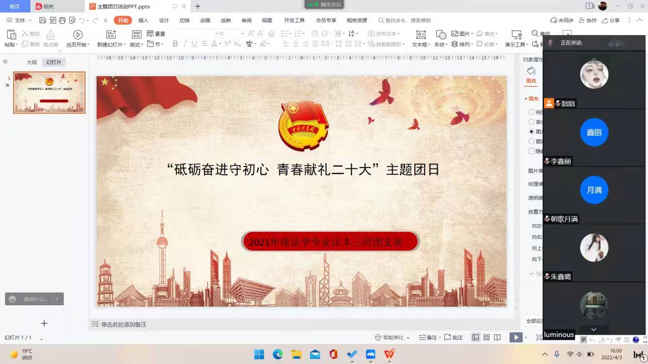 为深入贯彻学习《共青团中央召开电视电话会议学习贯彻习近平总书记重要讲话精神部署各级团组织主动投身疫情防控斗争》、《习近平总书记在深入推动黄河流域生态保护和高质量发展座谈会上的重要讲话精神》、《德州学院“第二课堂成绩单”制度实施管理办法》以及《德州学院第二课堂课程开设办法》,汲取其中宝贵经验,德州学院国产91中文综合字幕各团支部于2022年4月3日采取线上会议的方式开展“砥砺奋进守初心,青春献礼二十大”主题团日活动。