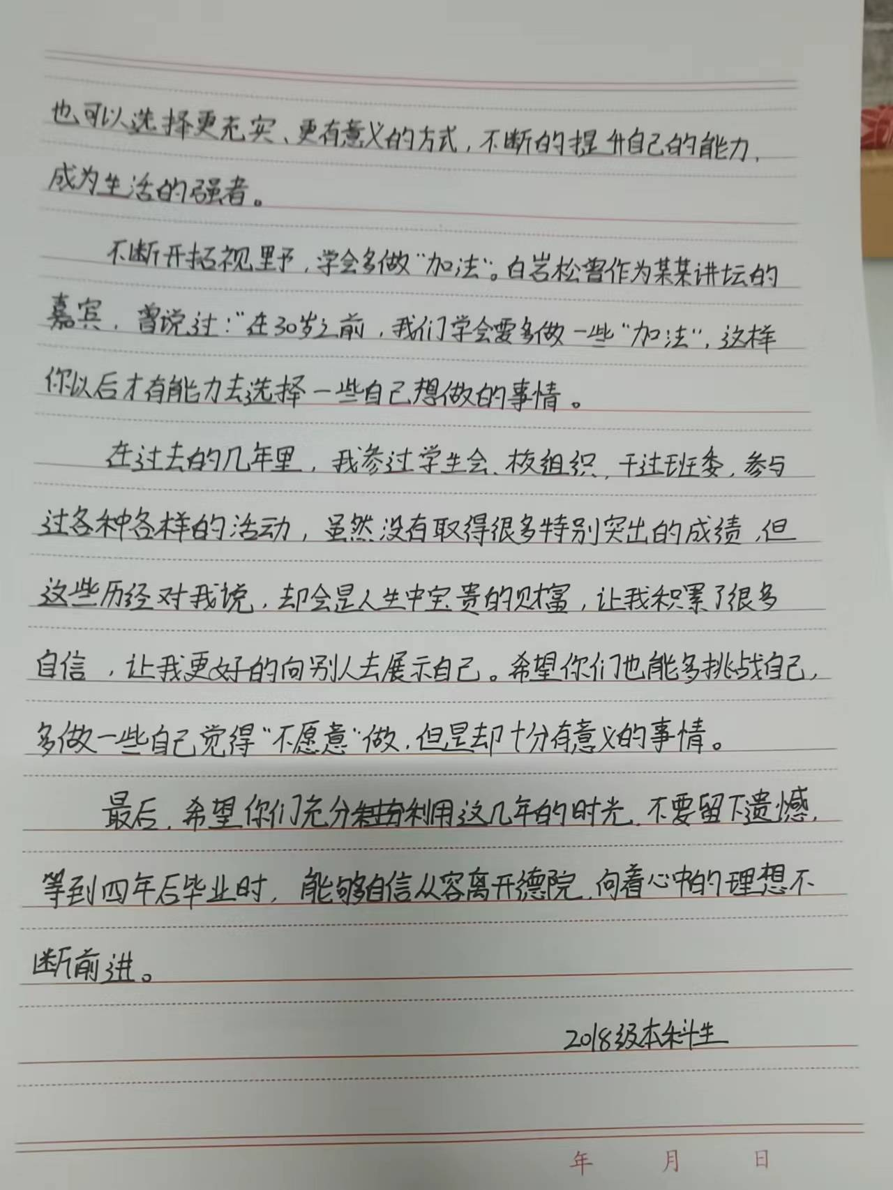 为更好传承德院学子的崇德品格,增进同窗情谊。国产91中文综合字幕开展“一纸书信传真情”活动,组织毕业生以寝室为单位,为未来即将住进寝室的“新房客们”留一纸书信。