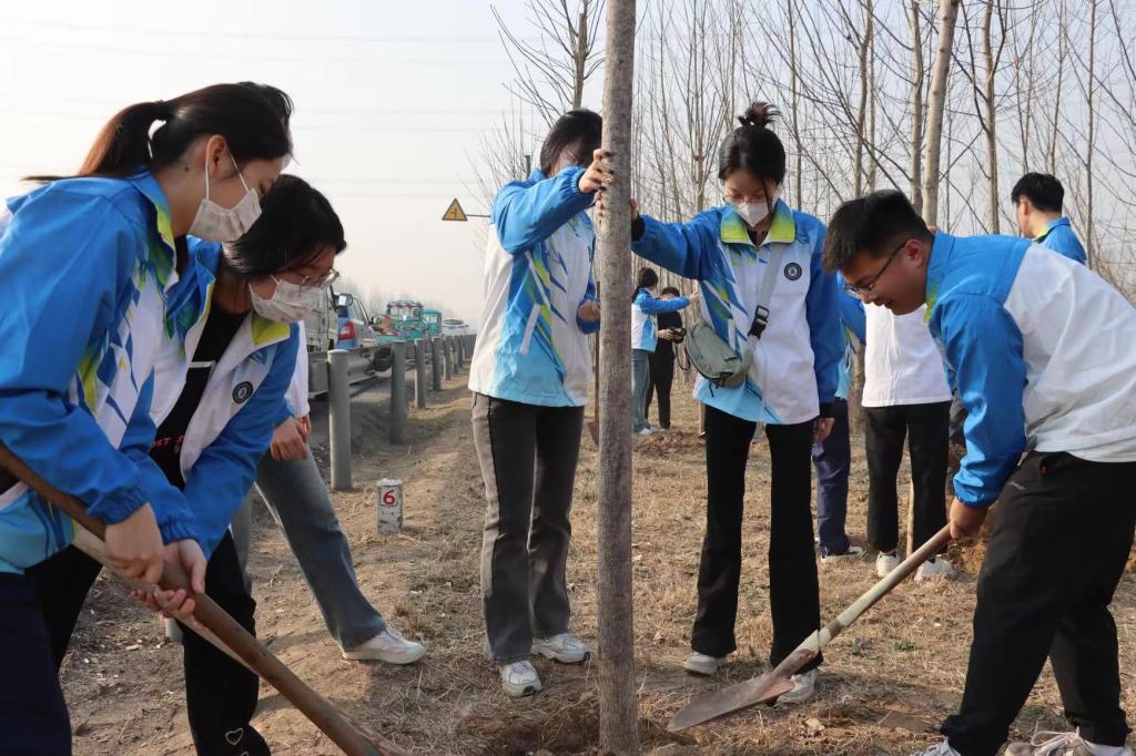 清晨,两单位组织50余名师生及员工驱车前往武城县四女寺镇沙杨村村口,就105国道道路两旁行道树白蜡树种进行了种植,种植范围3公里,种植树木116棵。
