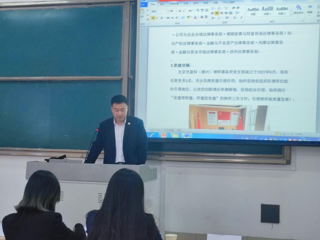 4月26日下午,盈科(德州)律师事务所党支部书记付辉、执行副主任李方超等一行人来我院开展座谈交流会。学院组织学生在博文楼427参加该座谈交流会。