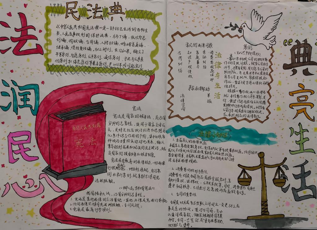 5月26日,“法润民心”手抄报比赛举行。赛前,专业教师对参赛学生进行培训,引导学生从生活中的现实案例、典型事件及相关民事诉讼案件中理解法律条文,为学生的创作奠定理论基础和提供设计灵感。参赛过程中,学生围绕主题,从版面设计、图形绘制、色彩搭配、文字书写等方面精益求精,一笔一划勾勒出对《民法典》的认知和理解,深刻诠释法治内涵。
