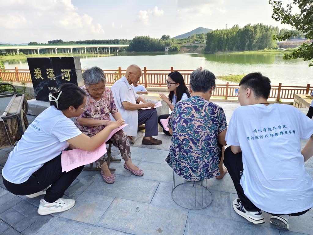 在黄河生态保护主题公园和平阴县黄河河务局宣传文化广场,服务团成员观察国情社情民情,通过发放宣传材料、开展问卷调查、搭建法律咨询点,为当地居民热心普法,并就乡村振兴中产业发展、生态宜居、乡风文明、生活质量、法治保障等方面问题开展交流和讨论,以实际行动诠释用法治保障黄河的生态意义。
