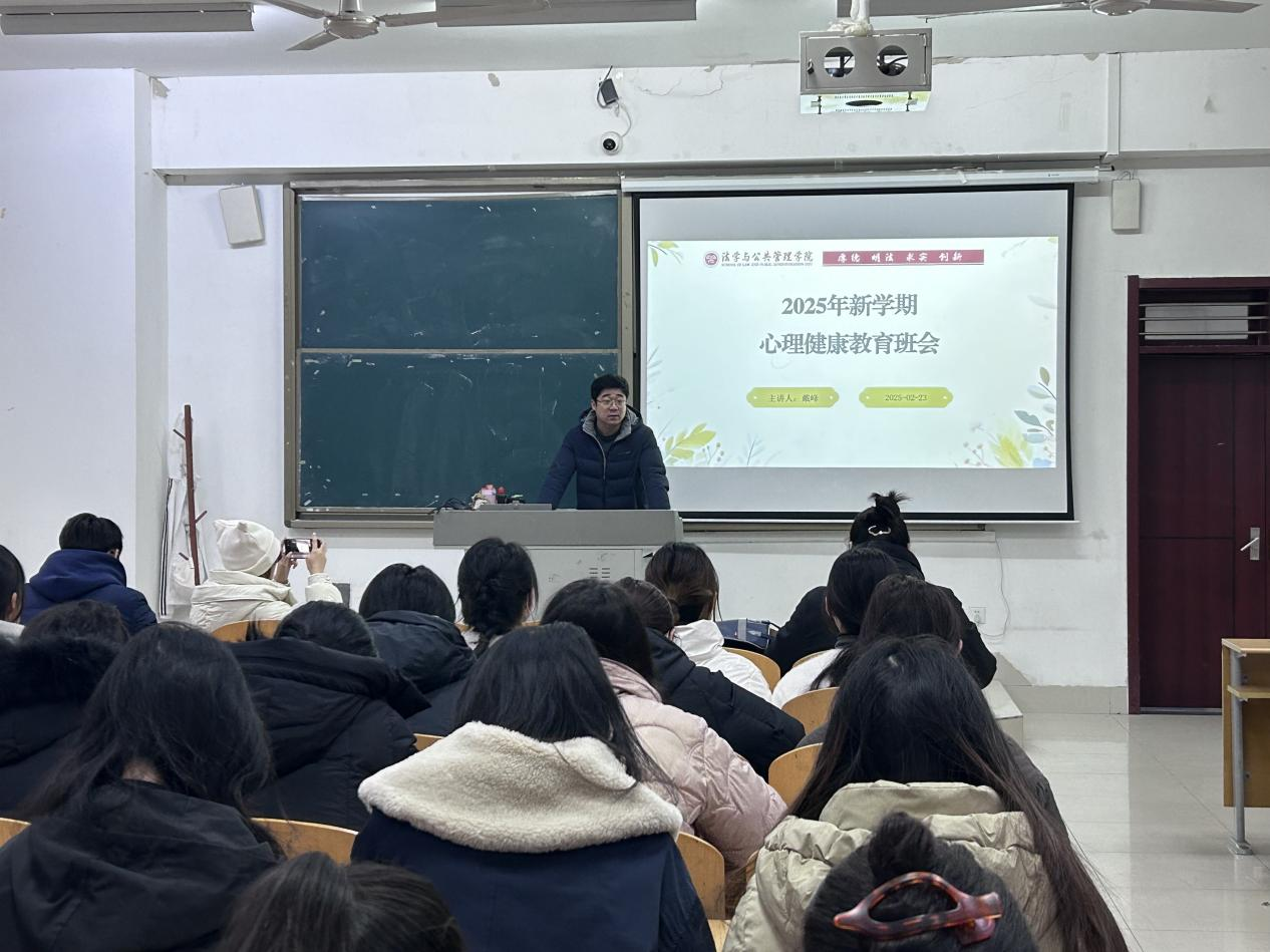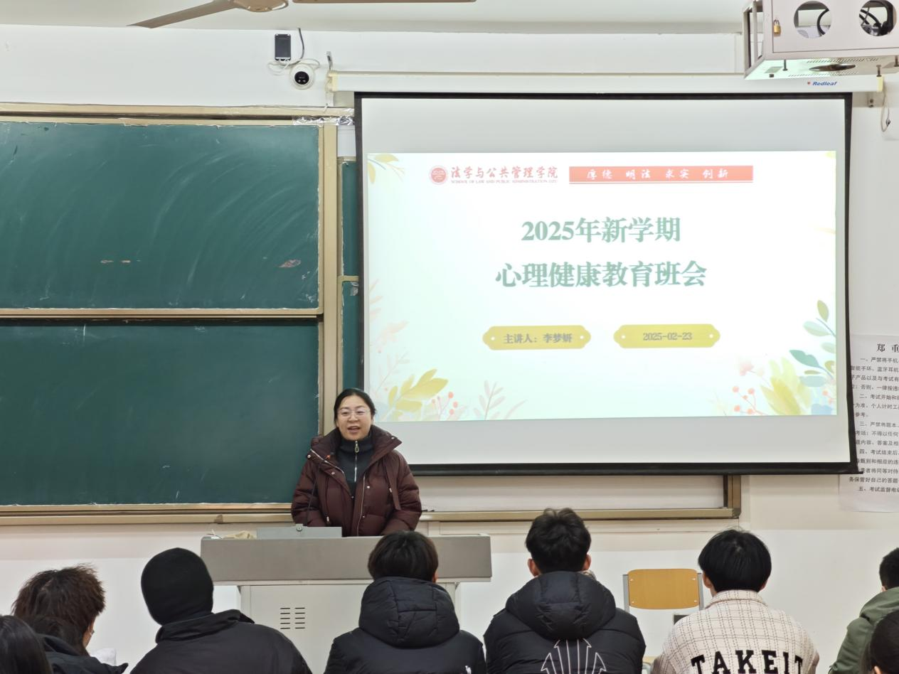 为加强学生的心理健康教育,帮助同学们以积极的心态迎接新学期挑战,法学与公共管理学院于2025年2月23日在博文楼召开“新学期‘心’启航”心理健康教育专题班会。