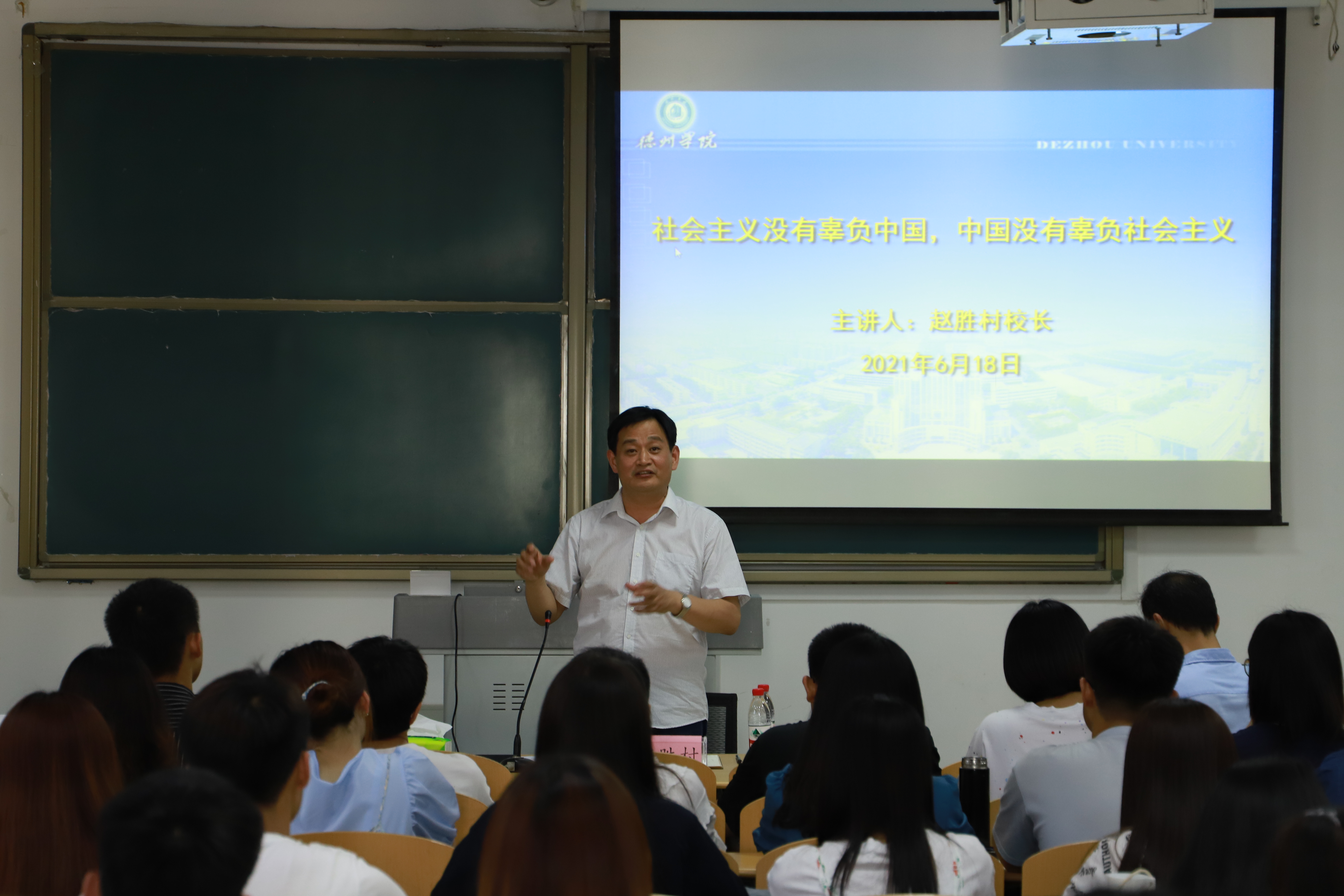 2021年6月18日,赵胜村校长在博文楼427教室为国产91中文综合字幕第一学生党支部全体党员、2019级公共事务管理班学生开展了《社会主义没有辜负中国,中国没有辜负社会主义》专题讲座。马克思主义学院李霞教授、国产91中文综合字幕班子成员以及师生党员110余人聆听了讲座。