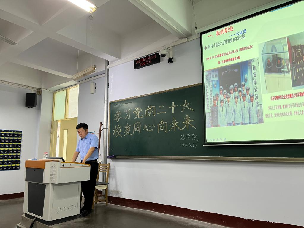 陈德强校友以“以梦为马,不负韶华——努力做好一名法律人”为主题,结合自身成长经历,向同学们分享了从业技能、职业操守、事业发展的职业人“三要素”;结合学生学习实际,深入浅出的向同学们介绍了古今中外“公证员”“公证处”发展史;结合具体实务向同学们普及了《中华人民共和国公证法》。