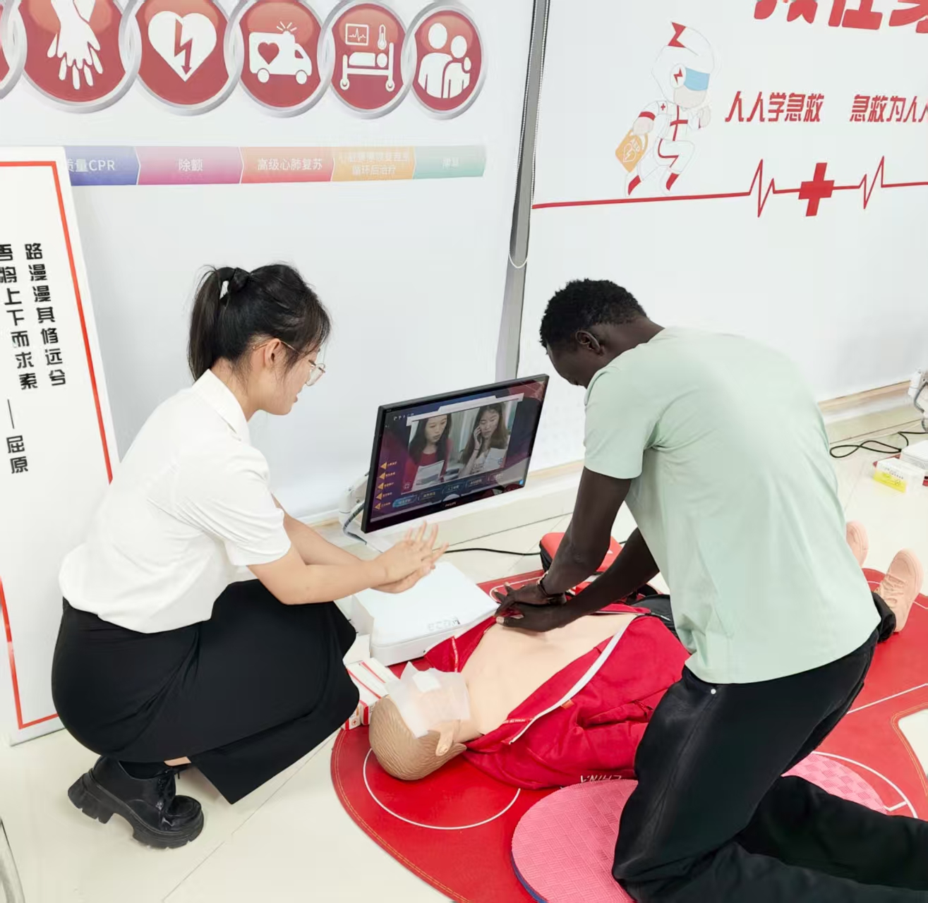 张莹莹同学还与参会领导和外宾学员一同考察省红十字会应急救护培训基地,详细了解基地的应急救护实训设施,并进行心肺复苏实操演练,对专业规范的应急救护培训流程有了更直观的认知,也为我院后续开展更具实操性、开放性的应急救护教学与交流活动开拓了视野、积累了经验。