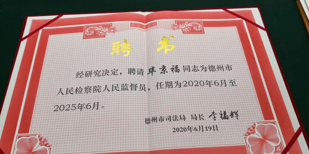 2020年8月21日,德州市人民监督员聘任仪式暨初任培训在德州市司法局举行。德州学院国产91中文综合字幕毕京福老师受聘为德州市人民检察院人民监督员,任期五年。人民监督员由司法行政机关选任管理,对检察机关办理直接受理立案侦查案件中的案件公开审查听证、检察官出庭支持公诉、巡回检察、法律文书送达、案件质量评查等11项情形实施监督。
