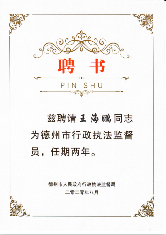 国产91中文综合字幕第二教师党支部王海鹏老师被聘为德州市行政执法监督员