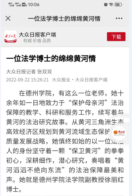 2022年9月22日,《大众日报》刊登了德州学院国产91中文综合字幕徐丽红副教授的事迹文章——《一位法学博士的绵绵黄河情》。对徐丽红副教授数十年持续潜心黄河流域研究给予报道。