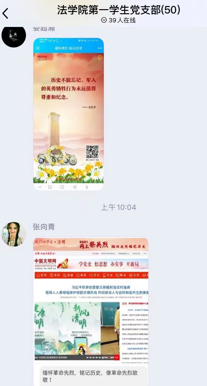 在中国共产党成立100周年纪念日即将来临之际,国产91中文综合字幕第一学生党支部积极组织支部全体党员通过线上、线下开展多种形式的“学党史祭英烈”清明节主题党日活动。